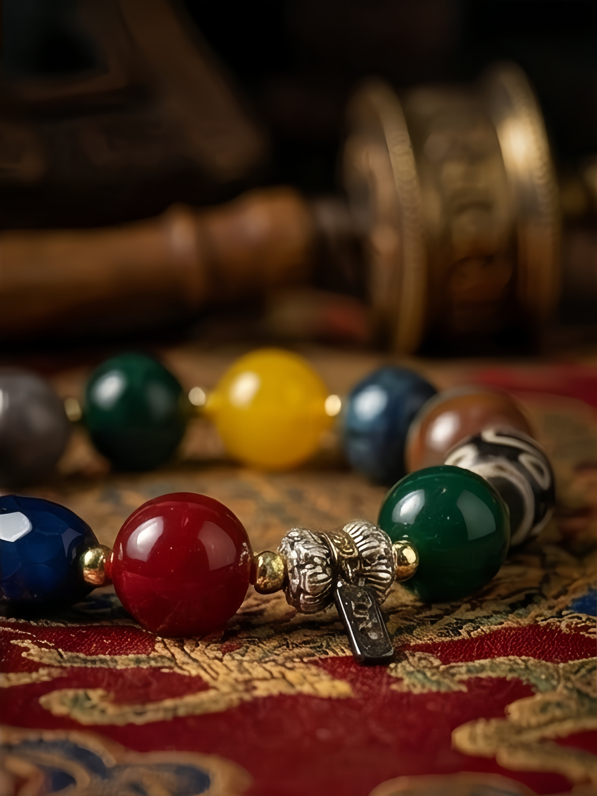 The colors are rich and deep, reminiscent of the vibrant murals found in ancient monasteries. The luster is natural and rounded, worn smooth as if by the thumb of a meditating monk. Whether you are navigating a busy city street or seeking silence in your own home, this bracelet serves as a gentle reminder to breathe, to trust, and to walk your path with courage.